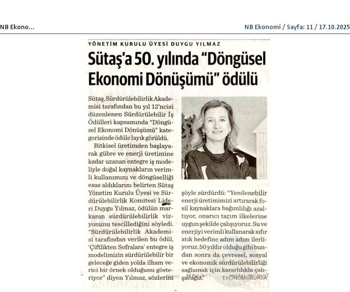 Sütaş’a 50. yılında “Döngüsel Ekonomi Dönüşümü” Ödülü